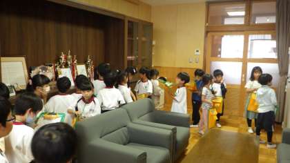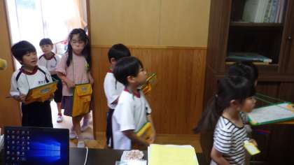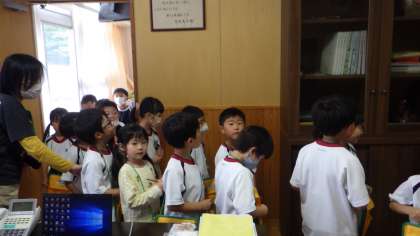 5/30 学校探検 1年生 公開日 2023/05/30 更新日 2023/05/30 各学年から 1年生の生活科「学校探検」の様子です。自分たちの教室以外の特別教室を見て回りました。写真は、校長室を訪れたときのものです。入り口で、挨拶や要件をきちんと言ってから入りました。「あの写真は何?」「この青いトロフィーが素敵」と興味津々でした。 1年