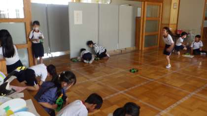 3年生の理科の授業です。ゴムで動くおもちゃを使って、実験をしていました。車を引く長さを変えて、車の動く距離を計測していました。協力して楽しそうに実験をしていました。