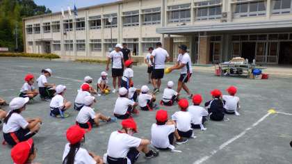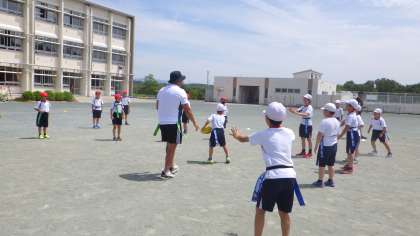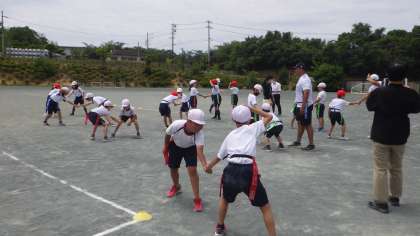 6/5 タグラグビー教室 4年生 公開日 2023/06/05 更新日 2023/06/05 各学年から トヨタヴェルブリッツの選手の方々6名が来校し、4年生の子どもたちにタグラグビーを教えてくださいました。 子どもたちは、鍛え抜かれた体のラグビー選手を前に、興奮気味。意欲的に練習に取り組みました。写真は、ボールの扱いやタグの取り方を練習しているところです。 4年