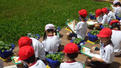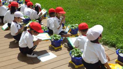1年生の生活科の様子です。アサガオが大きくなってきました。葉を数えたり、葉っぱの様子を絵に描いたりしていました。