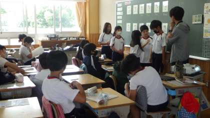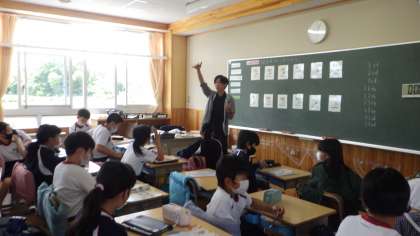 5年生の英語の授業です。誕生日を尋ねたり、答えたりする会話を練習しました。その言い方を使って、誕生日順に並ぶゲームをしていました。