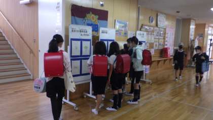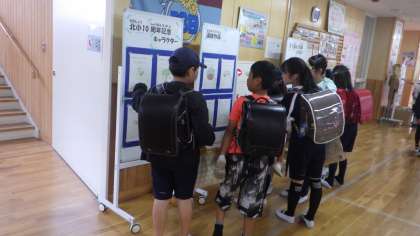 6/6 10周年キャラクター投票 公開日 2023/06/07 更新日 2023/06/07 学校の特色ある活動 10周年のキャラクター候補10作品を掲示し、全校児童の投票で決めます。掲示されているところに子どもたちが来ては、「この絵がいいな。」「こっちとこっち、迷うなあ。」と話しています。