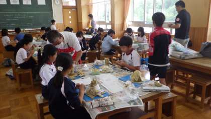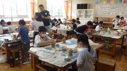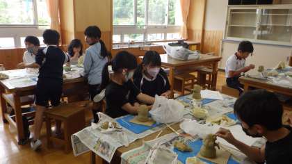6/6 シーサー作り 4年生 公開日 2023/06/07 更新日 2023/06/07 各学年から 4年生の図工の授業です。講師の方に入っていただき、焼き粘土でシーサーを作りました。一心に粘土をこねたり、つまんで形を作ったりして、集中して作っていました。表情が様々で、一つ一つ違った、楽しい作品ができました。 4年
