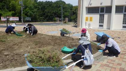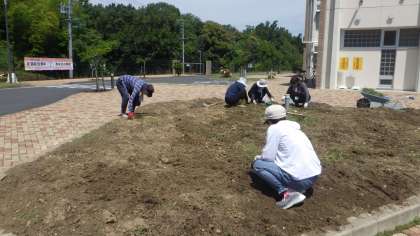花壇ボランティアの方々が、玄関前の花壇を手入れしてくださっています。終わったパンジーや草を抜き、次の花壇の準備をしてくださいました。暑い中、ありがとうございました。