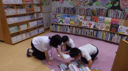 にこにこ組が、授業でメディアセンターを利用していました。「校長先生、この本とこの本の表紙は、絵がつながっているんだよ。」と教えてくれました。学校図書館司書とともに、本を探していました。