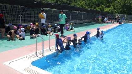 2年生の体育、プール開きの様子です。水の中に入るときに、歓声があがっていました。少しずつ水慣れをしていきます。
