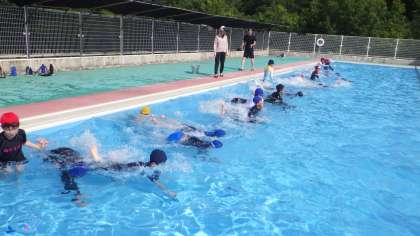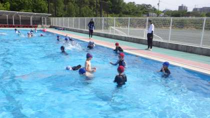 5年生の体育、プール開きの様子です。プールの底に沈む宝を、潜って取るゲームをしていました。楽しそうでした。