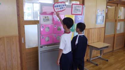保健室の前の掲示が新しくなりました。保健室にあるものの絵があり、それは何のためにあるのかを考えるクイズになっています。保健室を使うきまりを、楽しく覚えられます。