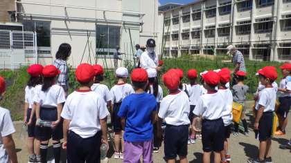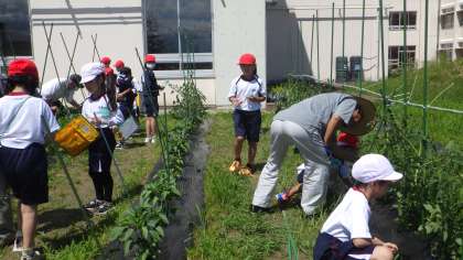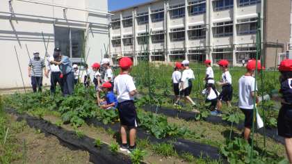 畑ボランティアの方々が、支柱を立てたりネットを張ったりする作業をしてくださっているところへ、2年生が野菜のお世話をしに来ました。ボランティアの方々に挨拶・お礼を言い、お世話と観察をしました。「なすの小さいのがなっているよ。」「お水は上げない方がいいですか。」等、畑ボランティア(野菜名人)の方々と交流をしました。