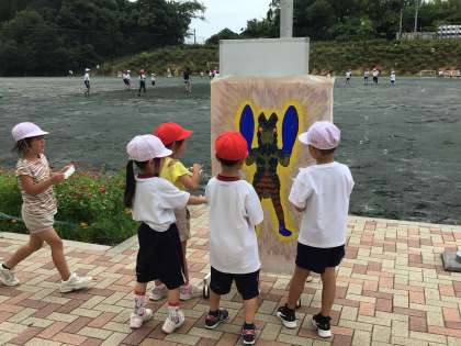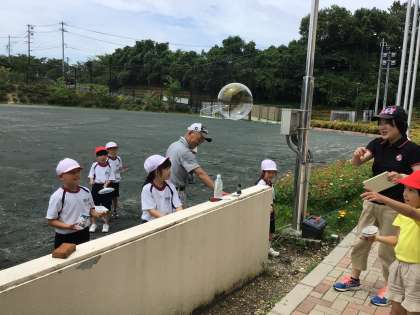 7/14 しゃぼん玉 1年生 公開日 2023/07/14 更新日 2023/07/14 各学年から 1年生の生活科の授業です。しゃぼん玉遊びをしていました。学校で用意した物以外に、ハンガーや網、トイレットペーパーの芯など、しゃぼん玉遊びに使えそうな物を持ってきて、いろいろなしゃぼん玉を楽しみました。「見て。あんなに大きなしゃぼん玉。」「校長先生、見てて。ちいちゃいのがいっぱいできるよ。」と話し、にこにこでした。昨年度の運動会で使った怪獣も登場し、しゃぼん玉遊びが盛り上がりました。 1年
