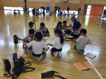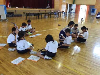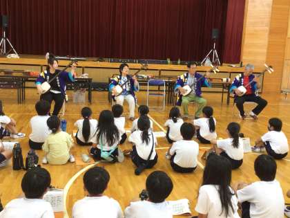 7/14 三味線体験 4年生 公開日 2023/07/14 更新日 2023/07/14 各学年から 豊田市文化振興財団より講師を派遣していただき、三味線体験を4年生が行いました。講師は芳泉会の皆様方です。 まず、講師の方々の演奏を聴きました。迫力ある、リズミカルな演奏に見入り、「かっこいい。」とつぶやいている子もいました。 次に、持ち方や音の出し方を教えていただき、グループに分かれて練習しました。 4年