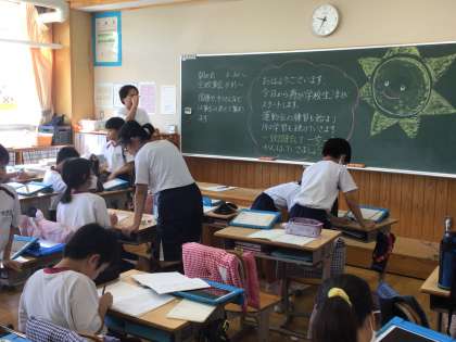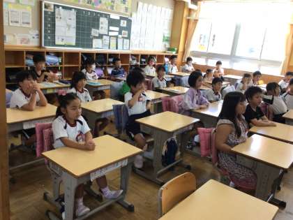 学級の約束事を確認したり、避難訓練についての事前指導を受けたりしました。教室の中は冷房で快適です。