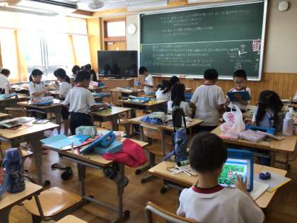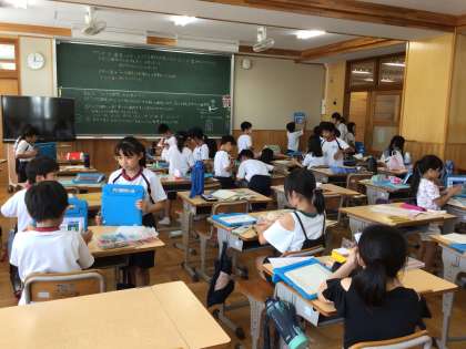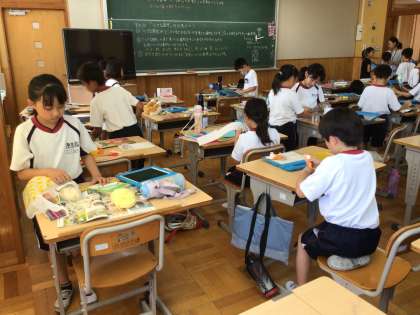 3年生の図工の授業です。学習用タブレットを使い、自分の写真を小さく入れ込んで、作品を作っていました。「お花畑に自分を置いたよ。」と教えてくれました。