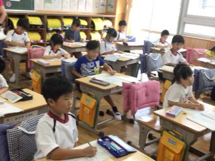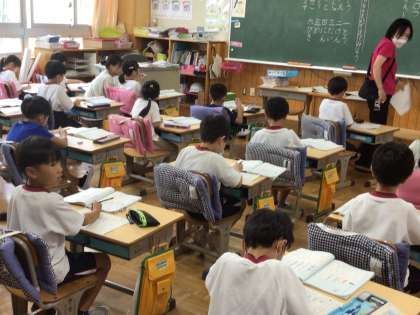 1年生の国語の授業です。いろいろなものを数える活動で、挿絵を見ながら「象が一とう」「家が二けん」「自転車が三台」などと数えました。