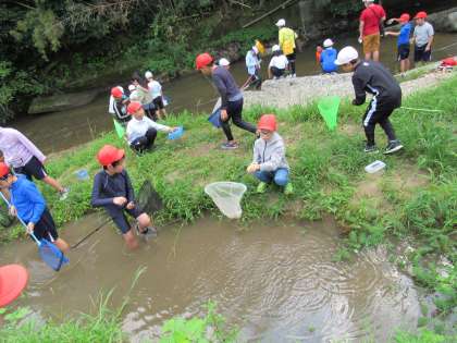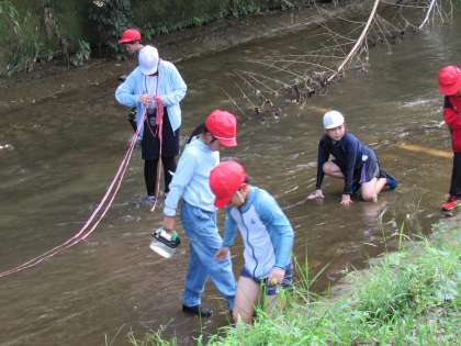 9/13 川の学習 4年生 公開日 2023/09/13 更新日 2023/09/13 各学年から 4年生の総合的な学習の時間です。伊保川での活動です。川の流れ、水生生物、伊保川の歴史など調べたいことから、グループ分けをして活動を進めています。 川の流れの班は、写真のように、タフロープにペットボトルを取り付け、何秒で流れるかという実験をしていました。 4年