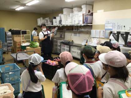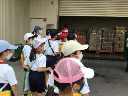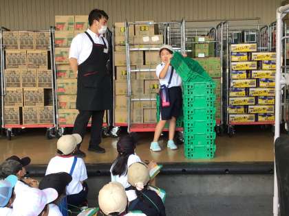 9/20 バローの見学 3年生 その2 公開日 2023/09/21 更新日 2023/09/21 各学年から お店の中だけでなく、バックヤードも見せていただきました。白菜を切る大きな包丁にびっくり。積み重ねてもかさばらない箱の工夫も教えていただきました。見学してきたことを、子どもたちは思い出してノートにまとめたり、授業で発表したりして生かしていきます。実際に見ることで、とてもよい勉強ができます。 教えてくださったバローの皆様、お忙しい中、本当にありがとうございました。 3年