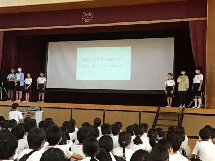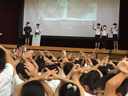 9/25 児童集会 公開日 2023/09/25 更新日 2023/09/25 学校の特色ある活動 今日の児童集会は、図書委員会と企画委員会が発表をしました。 図書委員会は、図書館のきまりなどをクイズにして発表をしました。子どもたちはクイズを楽しみながら、きまりの確認をすることができました。 企画委員会はあいさつについて発表しました。あいさつのポイント、あいさつのよさについて、パワーポイントを使ってはきはきと伝えました。 委員会