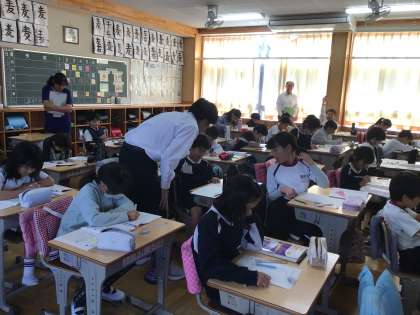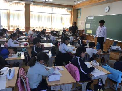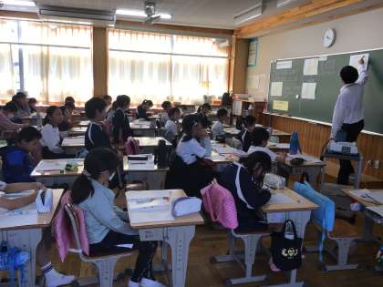 4年生の算数の授業です。補助線を引いて工夫して面積を求めていました。