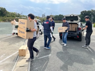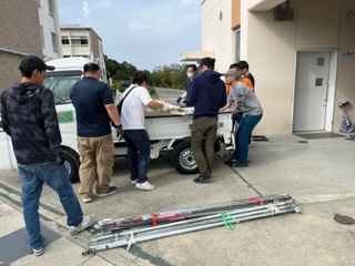浄水北小学校の運動会では、児童席・保護者席にテントを張ります。多くのテントを使うので、学校のテントでは足りず、自治区や近隣の学校からテントを借ります。PTCA会長に計画をしていただき、テントの運搬を行いました。