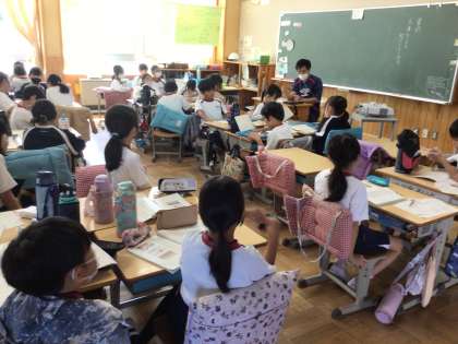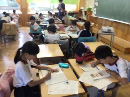 3年生の国語の授業です。教科書教材を使って、段落の内容を要約する練習をしました。