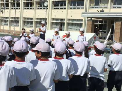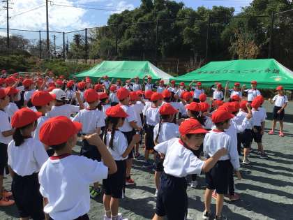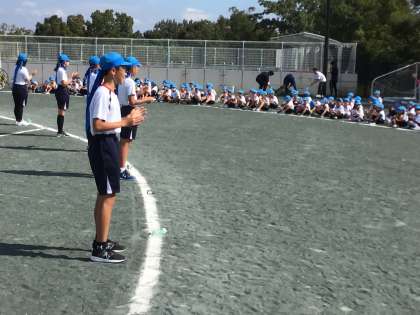 最後の全校練習で、開会式・閉会式を一通り練習した後は、チームに分かれて応援合戦の練習です。6年生が中心になって、チームの下学年に応援の仕方を教えていました。
