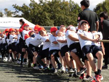 全校種目「引け!綱!〜TUNAHIKI〜」です。全校種目を考えるときに、「大玉送りだとあっという間に、玉に触らないで終わってしまうかも。」「勝ちたい気持ちをダイレクトに表せる綱引きはどうだろう。」「場所移動を少なくすれば、時間をかけ過ぎないでできるのではないか」と教職員が話し合い、綱引きに決まりました。
