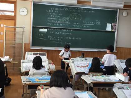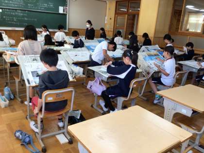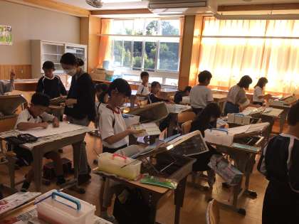 10/31 読書感想画 3年生 公開日 2023/11/01 更新日 2023/11/01 各学年から 3年生の図工の時間です。「海のがくたい」というお話を読んで印象に残った場面の絵を描いていました。図工室の机は教室の机よりひとまわり大きく、角度をつけることもできます。水道も部屋の中にいくつもあるので、彩色の活動がしやすくできています。 3年