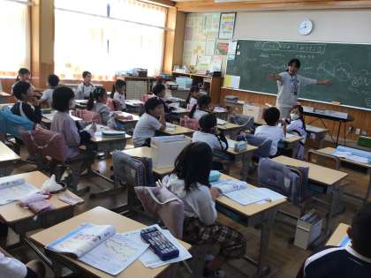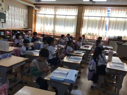 2年生の音楽の授業です。輪唱で歌を歌っていました。繰り返しの部分を楽しみながら、互いの声を聞いて歌いました。