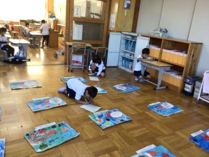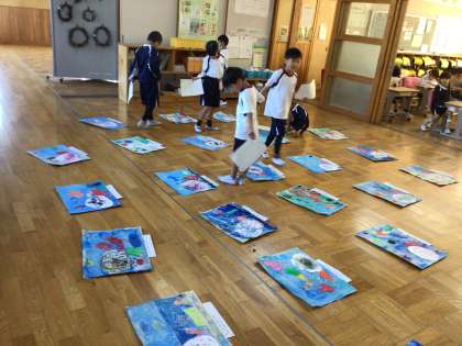1年生の図工の授業です。友達の絵を見て、どんなところがよいと思ったかをプリントに書いていました。