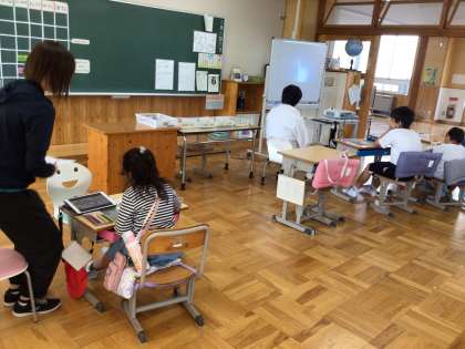 おひさま・にこにこ・ひだまり組の個別学習の様子です。自分の学習する内容について、タブレットやテレビを使ったり、担任と一緒に考えたりしながら進めていました。