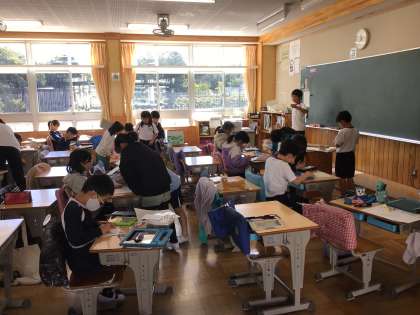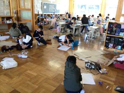 3年生の総合的な学習の時間です。まごころの森の生き物や植物について調べたことを発表する準備をしていました。何をしているのかを尋ねたら「発表する生き物になりきって発表するから、その準備をしている。」と教えてくれました。