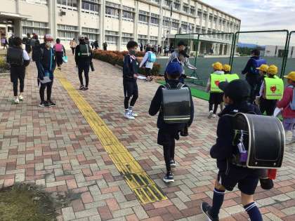 今日は、いつものあいさつ運動よりにぎやかでした。よく見ると、何かを配っている子がいます。まごころ委員会でした。「まごころカードのキャンペーンをやっているので、まごころカードをたくさん書いてもらえるよう、カードを配ることにした。」と教えてくれました。