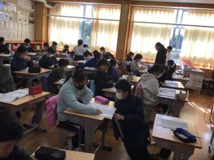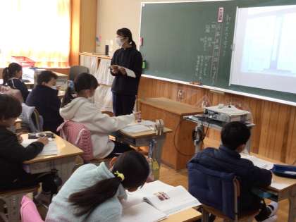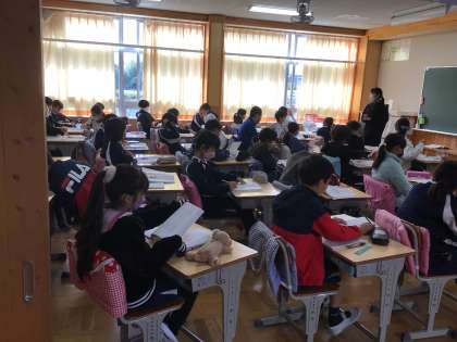 5年生の国語の授業です。説明文「和の文化を受けつぐ」を読み、序論、本論、結論に分ける活動をしていました。