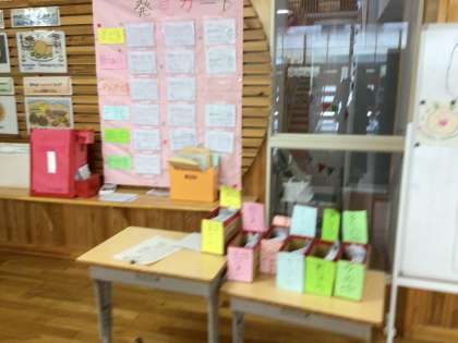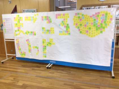 まごころ委員会は、「テンテンと一緒に10周年を祝おう」キャンペーンを行っています。まごころカードを書くように呼びかけ、お昼の放送で紹介したり、文字が浮き出てくるようにした台紙にまごころカードを貼ったりしています。あと少しで字が完成しそうです。
