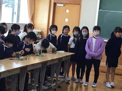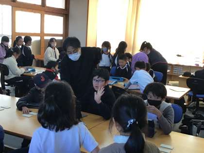 3年生がクラブ活動を見学しました。来年度から参加するクラブを選ぶ参考にします。教室を静かに回り、興味深そうにのぞき込んでいました。