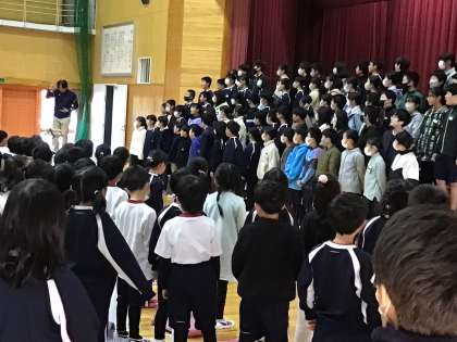 全校集会がありました。人権週間が近いので、校長が人権について話をしました。金子みすゞさんの「私と小鳥とすずと」の詩を紹介し、一人一人がお互い違うこと、お互いの良さを認めることが大事だということを話しました。