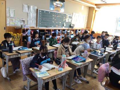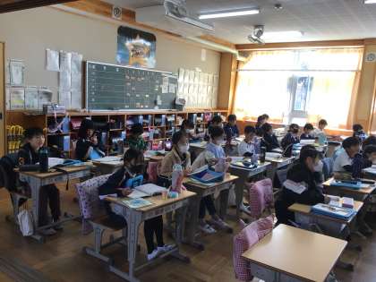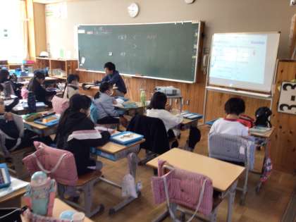 3年生の算数の授業です。問題集を使って、分数の問題を解き、復習をしていました。問題集のページを大きくプロジェクターで映し、確認しながら書き込んでいました。