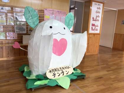 テンテンが昇降口の真ん中に座り、まごころ発表会・10周年記念でお越しの皆様をお出迎えします。