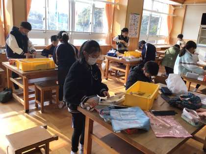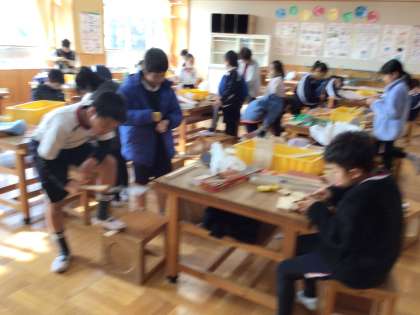 4年生の図工の様子です。のこぎりや金づちを使って、木片を使って様々な物を作っていました。