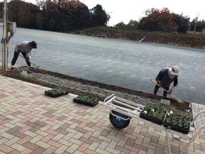花壇ボランティアの方々が、運動場の花壇に、パンジーの苗を植えてくださいました。冬の花壇に彩が加わりました。