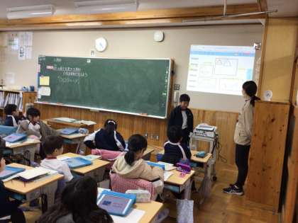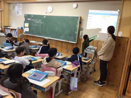 3年生の算数の授業です。いろいろな三角形を仲間分けし、その理由を発表していました。学習用タブレットを使って書き込んだ自分の考えを、大きく映しながら発表して説明をしました。