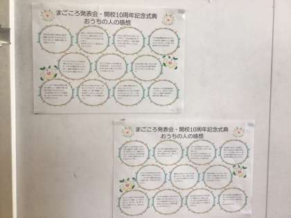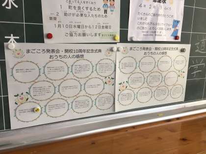12/21 メッセージ 公開日 2023/12/21 更新日 2023/12/21 学校の特色ある活動 まごころ発表会・10周年記念のときに、保護者からメッセージを募集し、学習用タブレットで打ち込んでいただきました。たくさんの温かなメッセージが集まりました。ありがとうございました。教員で情報を共有し、該当の学年へのメッセージをピックアップし、各学年の子どもたちが読めるよう、教室やオープンスペースに貼っています。子どもたちの学習の励みになりました。