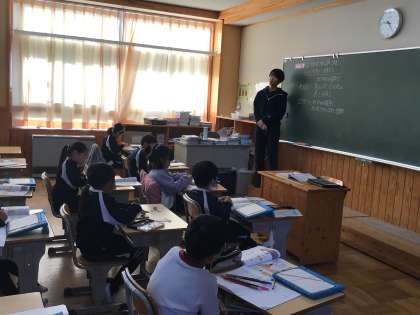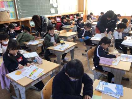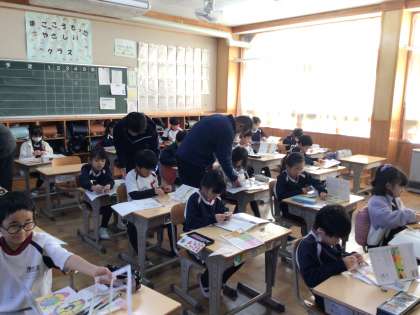 2年生の算数の授業です。今まで習った「長方形」「正方形」「直角三角形」について復習した後、それらの形の色板を使って、模様を作る活動をしました。