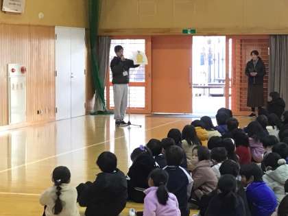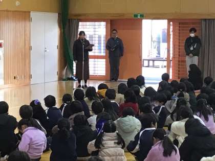 冬休み前の集会を行いました。校長からは、夏休み以降の振り返りと冬休みにお手伝いをしようという話をしました。冬休みの生活、交通安全について、各担当から話をしました。