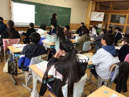6年生の英語の授業です。「昨日、何食べた?」と尋ね答える会話を学習しました。その前に、いろいろな食べ物の出てくる英語の歌を歌ったり、食べ物の単語の練習をしたりしました。