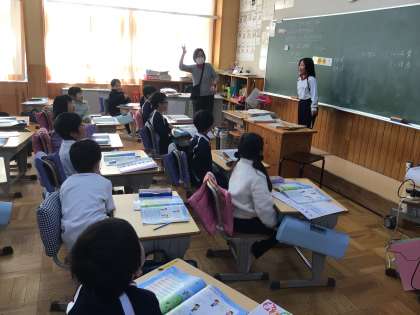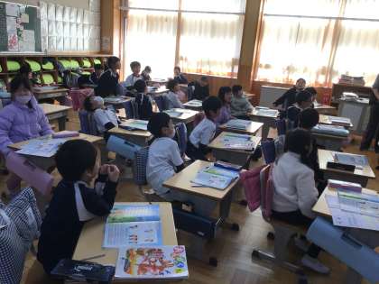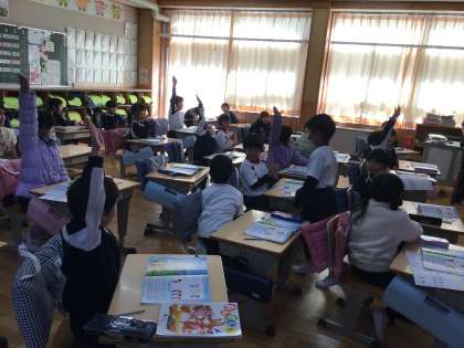 1年生の音楽の授業です。友達の言った言葉や節回しを真似て、やまびこのように返す「まねっこ遊び」を楽しそうに行っていました。