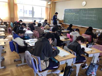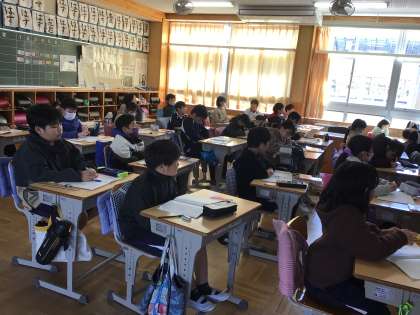 4年生の算数の授業です。分数の学習で「真分数」「仮分数」という言葉を初めて習いました。ノートにしっかり書いて覚えます。