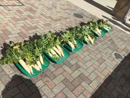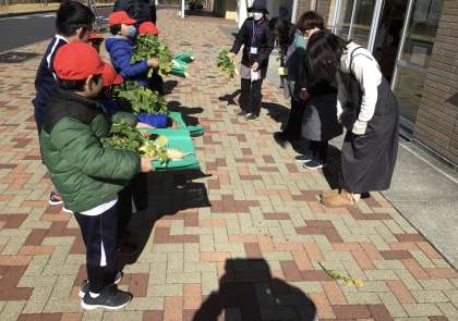 1/26 大根の収穫 おひにこ 公開日 2024/01/26 更新日 2024/01/26 各学年から 育てた大根を、おひさま・にこにこ・ひだまり組が収穫しました。たくさん収穫し、水で洗いました。冷たいのを我慢して洗いました。 獲れた大根を共働本部に持っていき、「使ってください」と渡しました。明日食べる豚汁の材料として使います。おひにこの皆さん、ありがとう。明日の豚汁は、どんなにおいしいでしょうね。
