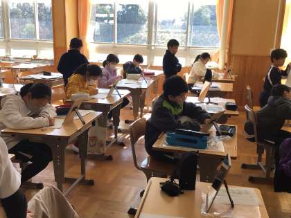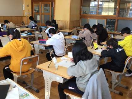4年生の図工の授業です。自分の顔を木版画にするために、鏡を真剣に見て、紙に描いていました。