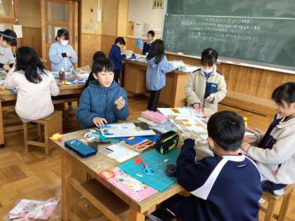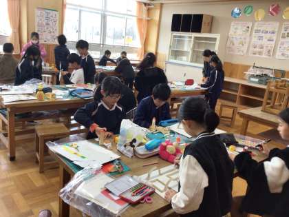 3年生の図工の授業です。マグネットを使って動かす仕組みで、何をどう動かすかを工夫して作品を作っていました。